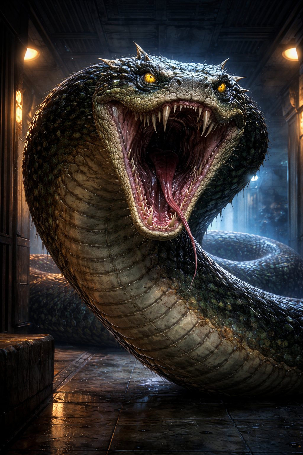 He gasped at what he saw. A giant snake was slowly coiling towards him. It had a brutal-looking face with a short snout and its mouth was open, revealing a thousand tiny teeth. His primary instinct was to run.