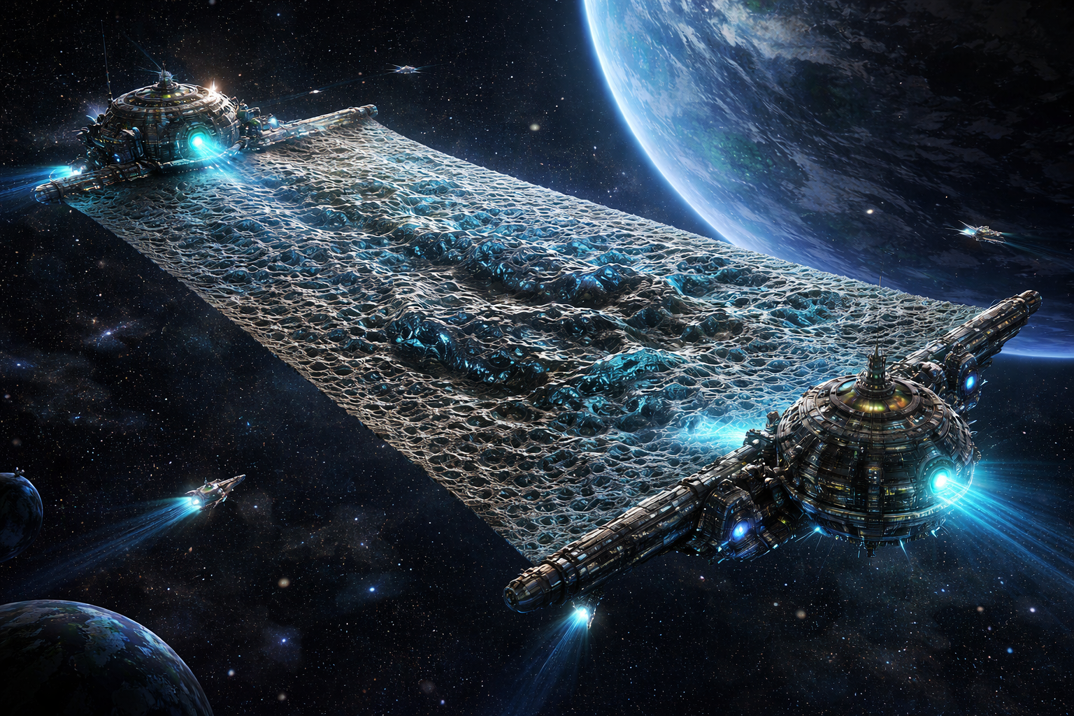 “The rail gun pushes the car into space. Once it reaches a particular distance, the balloon separates from the car which falls to the ground, further momentum pushes the balloon towards the destination. The rug is a stiff, plastic material – held together in space by gyro-crafts kept at the two wider edges of the rug. That builds in tremendous downward thrust as the balloon impacts – the net is the cancellation of the two forces as the balloon splatters open and deposits its content in the spongy mass of the rug. The crude which had been warming because of the atmospheric resistance impacts the rug and flash-freezes inside the rug because of the minus temperatures in space. Multiple bombardments of balloons can deposit a tremendous amount of crude in the rug. Then the same gyro-craft propels it forward, connecting it to a warp-drive enabled craft which can tug it across larger distance.”